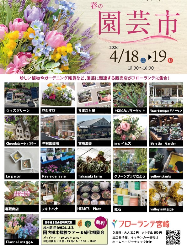 News & Events 2026-04-14 by andersen イベント 4月18日(土)&19日(日) 『春の園芸市』@フローランテ宮崎 🌷フローランテ宮崎 『春の園芸市』🌷 日時:4月18日(土)&4月19日(日) 10:00~16:00 場所:フローランテ宮崎(入園料310円) イベントの出店のお知らせです🌿 珍しい植物やガーデニング雑貨など、園芸に関連するお店がフローランテ宮崎に大集合! アナーセンは花苗や雑貨、寄せ植えなど販売予定です♪ この季節おすすめの素敵なクレマチスもあります♡ お散歩がてら、ぜひおでかけください。 皆さまのご来場をお待ちしています。
